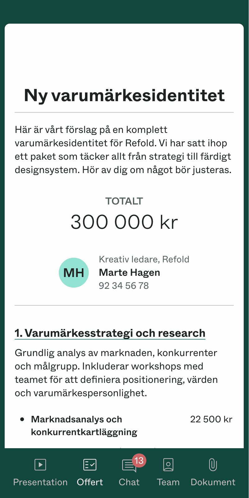 Kunden får en professionell, mobilvänlig offert som de kan bläddra igenom på telefonen.